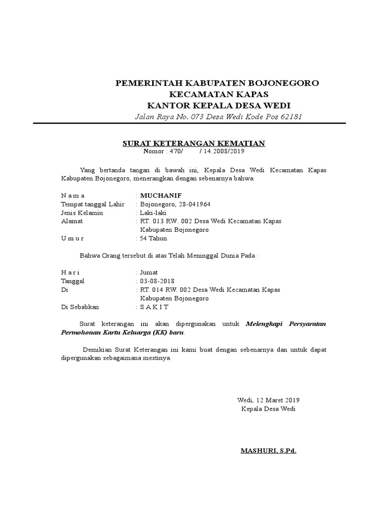 Contoh Surat Kematian Dari Desa ~ Contoh Surat Keterangan Tidak Mampu Dari Desa Ketua Rw Ketua Rt Contoh Surat. Surat keterangan kematian adalah surat keterangan yang menerangkan kematian atau meninggal dunia. Kode penomoran indeks surat desa/kode surat yang berlaku di desa (format kode surat) kode surat merupakan bagian dari proses tata kelola adm. Surat keterangan usaha biasanya dibuat oleh kepala desa atau kelurahan setempat untuk memberikan informasi bahwa usaha tersebut nyata, bukan fiktif belaka. Atas perhatian dan kerja samanya saya ucapkan terima kasih. Anda terlebih dahulu melengkapi syarat diperlukan sebelum mulai datang ke kantor kepala desa atau kelurahan, dimana dokumen perlu dilengkapi seperti:
